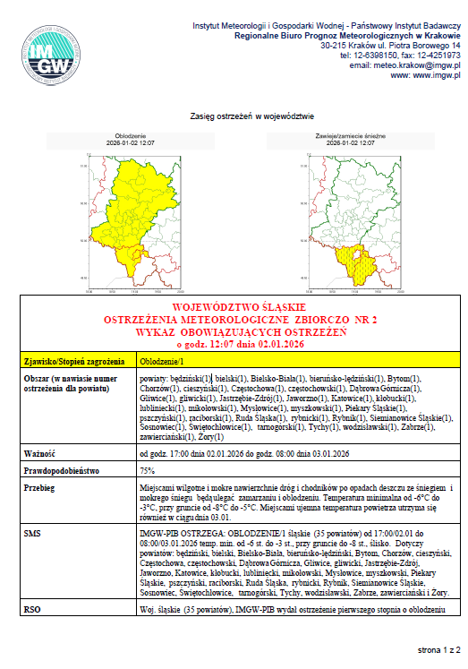 Regionalne Biuro Prognoz Meteorologicznych w Krakowie wydało ostrzeżenie meteorologiczne z dnia 02.01.2025r. dotyczące wystąpienia na terenie powiatu częstochowskiego zjawiska: oblodzenie.